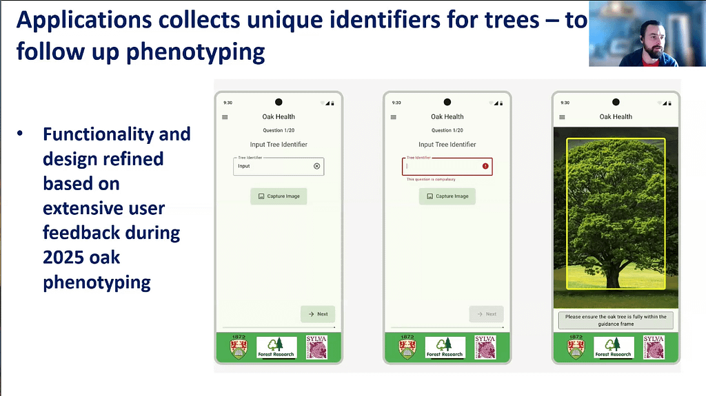 Up next was Thomas Wilson, a researcher from University of Aberystwyth, UK. Thomas described the Forest Lab project, a collaboration between the university, Forest Research and the Sylva Foundation, which is using digital tools to empower citizen and steward scientists to monitor the health of oak woodlands. The researchers have developed an app which allows users to collect and submit data on oak health such as crown condition and tree height. They are comparing this data with results from trained surveyors to refine the process and ensure user-submitted reports are reliable enough.