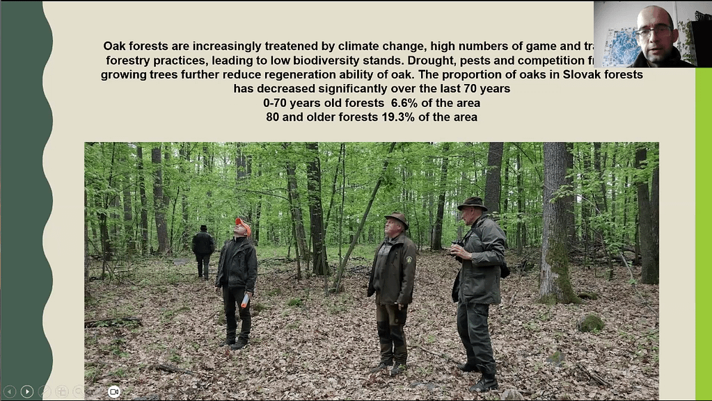 Our first speaker was Jozef Capuliak, a forester and manager of the Municipality Forests of Krupina, Slovakia. Jozef shared the history of the oak-beech forests he manages, which were preserved for community use by leaders including King Bela IV (13th Century) and Empress Maria Theresa (18th Century). However, the oak trees in these forests are being increasingly impacted by climate change, drought, pests and competition from faster growing trees. To tackle Jozef shared how they have been experimenting with ‘close-to-nature’ regeneration and management practices.