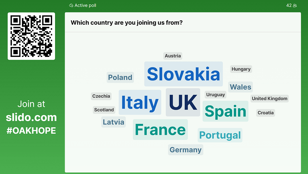 We invited the audience to share what they most want to get out of being part of the OAK-HOPE network and it is clear that, along with hearing about the latest science, collaboration and community are high on the wish list. There is also a strong desire for collective action on oak health.