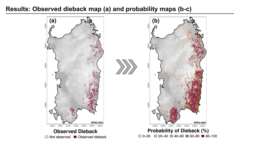 Gabriele Satta’s probability map compared to observed oak dieback